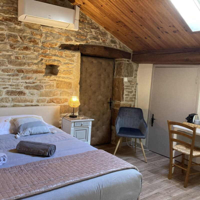 Située au deuxième étage, La Naturelle séduit par son caractère chaleureux et ses pierres apparentes qui racontent l’histoire de la maison.