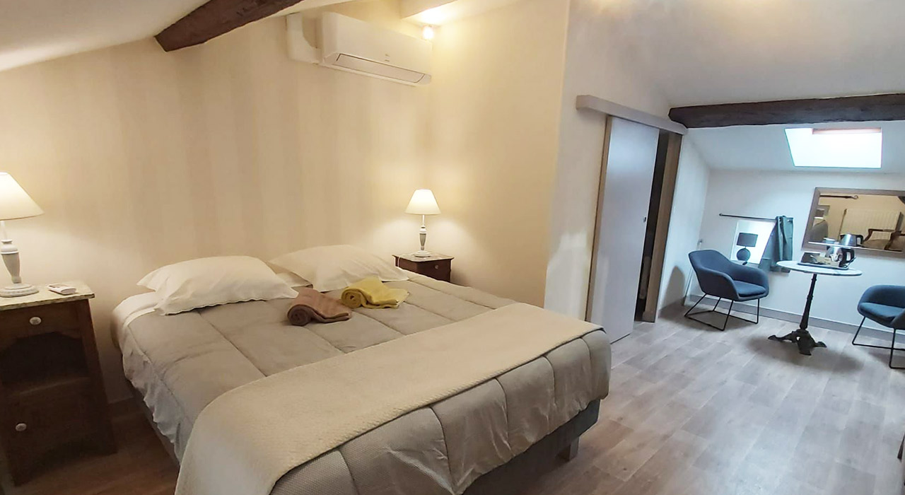La plus fraiche de nos chambres de par sa situation au rez-de-chaussée de la maison. Un lit de 180 cm (séparable). Espace extérieur dédié.