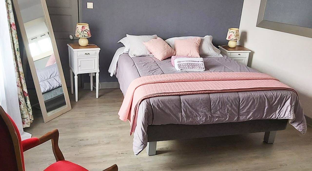 Une chambre coquette avec une touche fleurie. Un lit de 160 cm. Espace dédié sur le balcon.